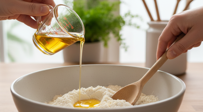 Ở một tô khác, bạn cho 150g bột mì cùng 70ml dầu ăn, sau đó nhẹ nhàng trộn đều tay cho đến khi bột thấm hết dầu và quyện lại thành một khối mịn, dẻo, không dính tay.