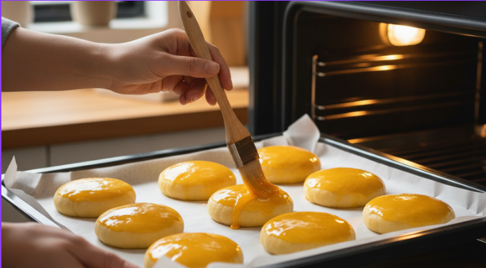 • Dùng cọ quét một lớp lòng đỏ trứng gà pha chút dầu ăn lên mặt bánh để khi nướng có màu vàng óng hấp dẫn.