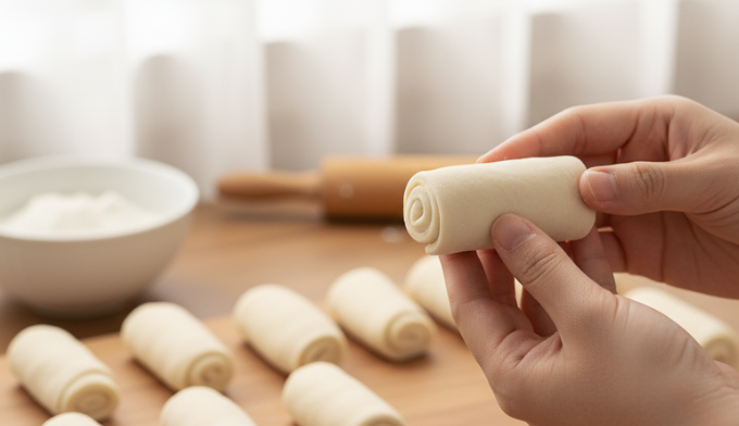 • Cán dẹt nhẹ, cuộn tròn lại như cuộn nem, xoay ngang, tiếp tục cán và cuộn thêm 1 – 2 lần để tạo lớp. Sau đó, cán dẹt ra để chuẩn bị bọc nhân.